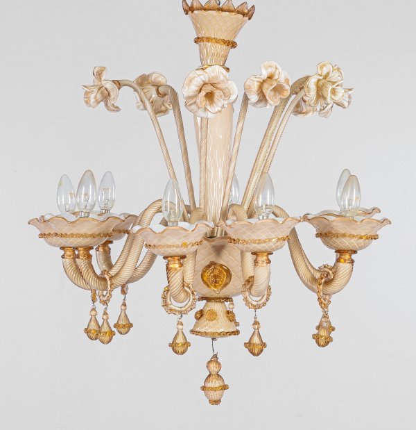8-flg.; Weißes Muranoglas, teilw. mit feinem Golddekor. Gegliederter Balusterschaft und großes Schalenelement mit erhaben reliefierten Maskarons. Davon ausgehend stark geschwungene Leuchterarme mit tief gemuldeten Traufschalen. Dekorationen aus gestreckten Rosenblüten. H. 68 cm. D. 65 cm.