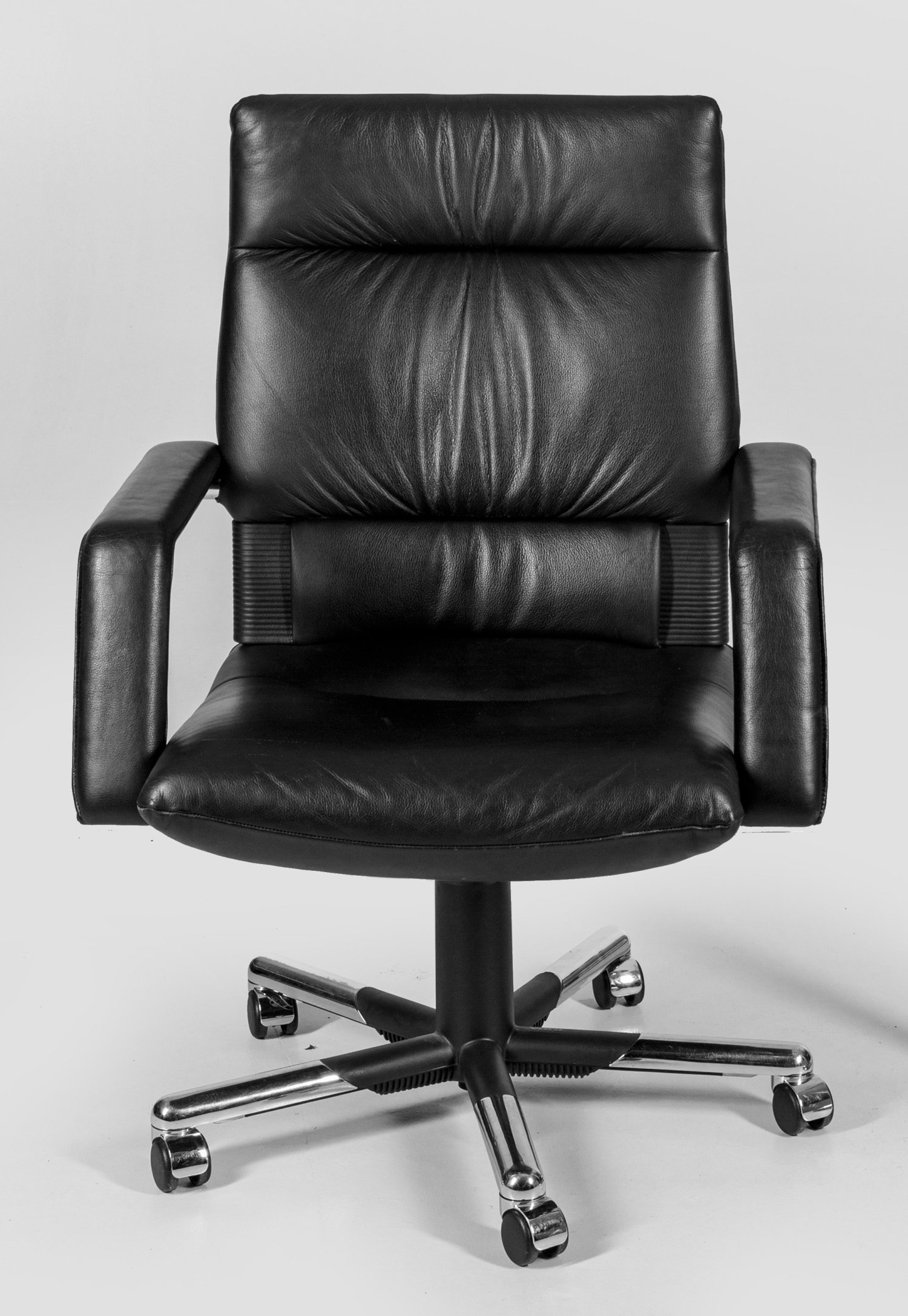 Metall, verchromt sowie schwarzes Leder. Über sternförmigem Fuß mit Rollen und zylinderförmigem Schaft höhenverstellbare Sitzfläche mit breiten Armlehnen. Rechteckige, zurückschwenkbare Rückenlehne. Herstellerzeichen sowie geritzte Künstlersignatur. Entw. Mario Bellini, 1984. Sitz-H. 45-53 cm.