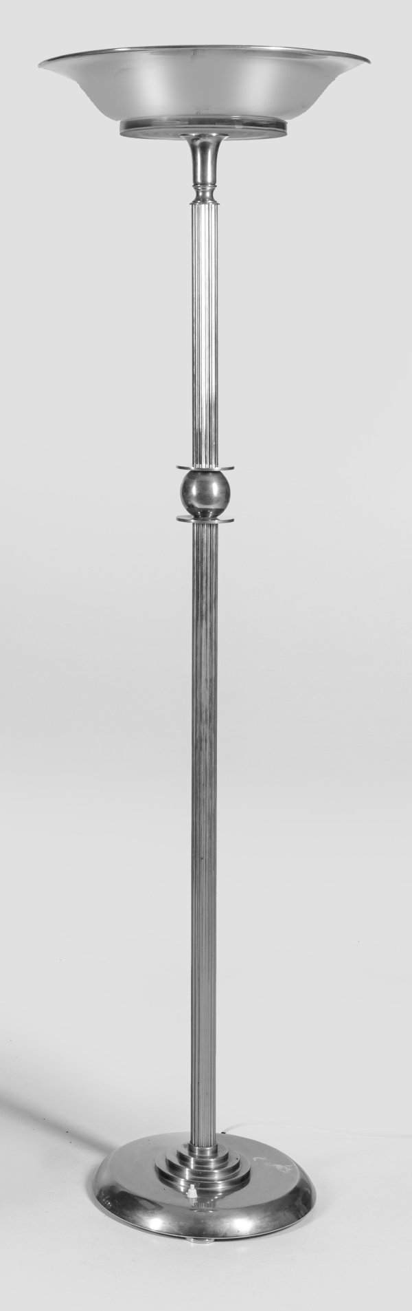 Metall, vernickelt sowie farbloses, satiniertes Glas. Über gestuft ansteigendem Rundsockel godronierter Schaft mit Kugelelement als Träger für flache, weit ausschwingende Lampenschale. Innen drei Fassungen für Leuchtmittel. Elektrifiziert. H. 172 cm.