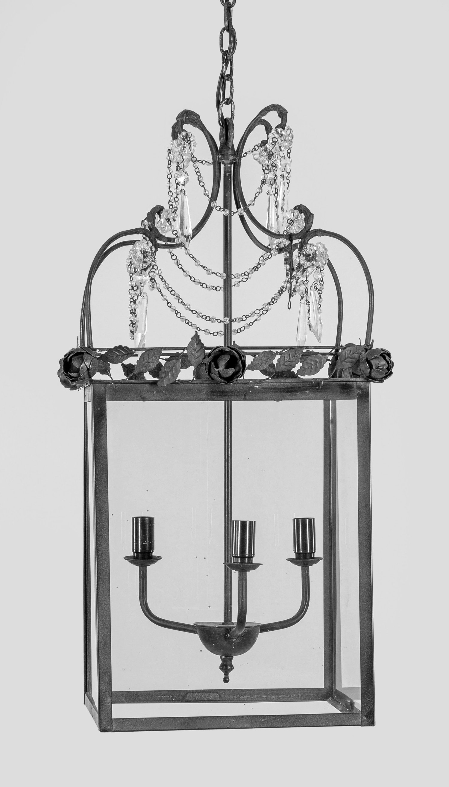 3-flg.; Metall, schwarz lackiert. Gekanteter Korpus aus schmalen Streben mit applizierten Rosenblüten. Oberer Abschluss aus gegeneinander gestellten Voluten mit Prismenbehang. Innen schlanker Schaft als Träger für Leuchtmittel. H. 70 cm. 36 cm x 36 cm.