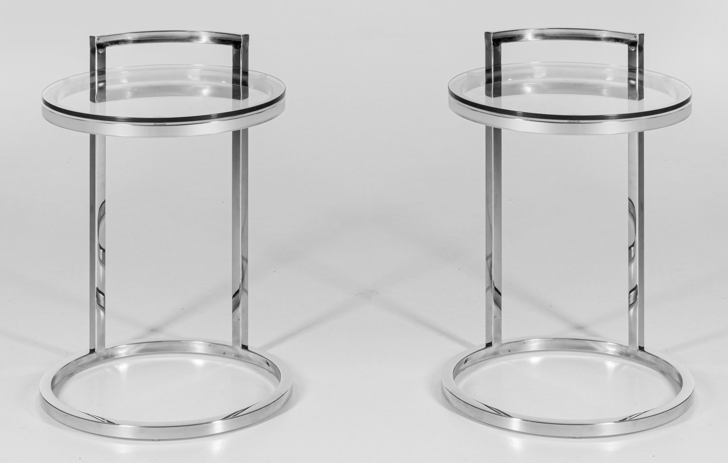 Metall, vernickelt und farbloses Glas. Gestell aus gekanteten Streben und Kreismotiven als Träger für runde Deckplatte. H. 56 cm. D. 38 cm.