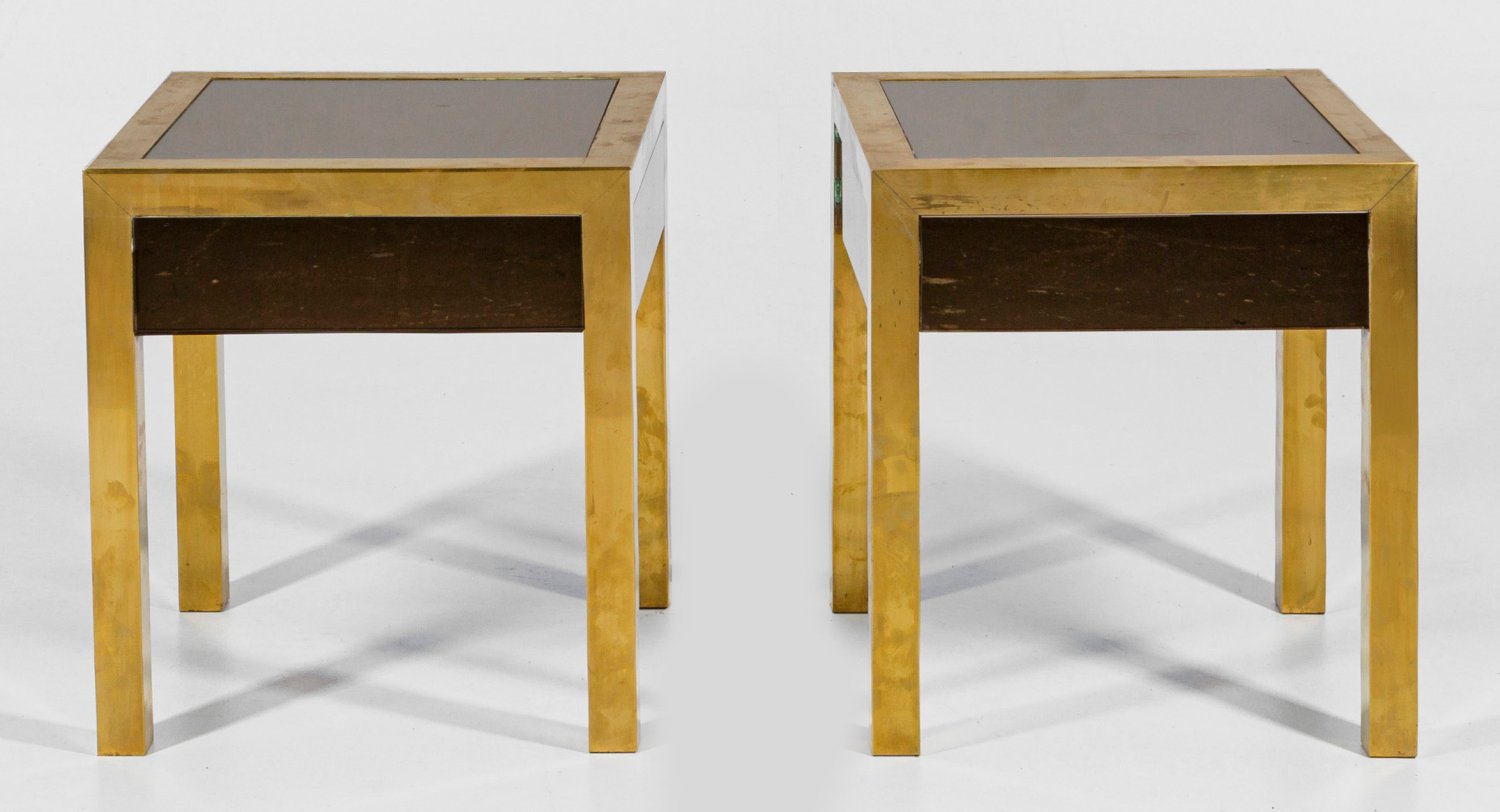 Messing und topasfarbenes Spiegelglas. Gerader, einschübiger Zargenkasten auf gekanteten Beinen, in entsprechende Deckplatte übergehend. Entw. wohl Sandro Petti. H. 50 cm. 45 cm x 45 cm.