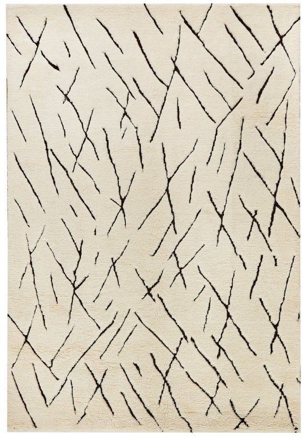 Marokko. Wolle auf Baumwolle. Auf cremefarbenem Fond flächendeckende Musterung aus asymmetrisch angeordneten, schwarzen Strichen. 243 cm x 169 cm.
