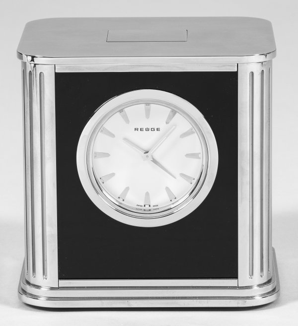 Edelstahl und schwarzes Glas. Gerader, rechteckiger Korpus auf flacher, gestuft ansteigender Basis mit gerundeten, kannelierten Ecken, gering überstehende Deckplatte. Verglastes Zifferblatt mit Indexen, bez. "REUGE Swiss made". Werk mit Handaufzug und Weckfunktion in Form eines gefiederten Singvogels nach Vorbild der historischen Singvogel-Spieluhren. Herstellerzeichen. H. 15 cm. 14,7 cm x 12,3 cm. Original-Schatulle, Gebrauchsanweisung und Garantiekarte.
