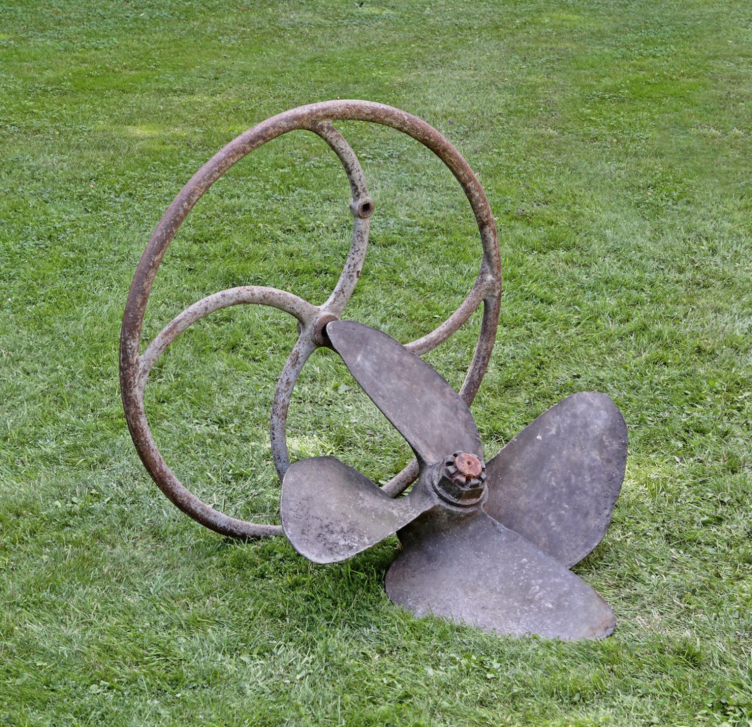 Schiffsschraube und großes Ventilrad. Eisen, teilw. mit Resten alter Lackierung. Altersspuren. Schiffsschrauben-D. 82 cm. Rad-D. 91 cm.