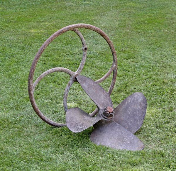 An iron ship's propeller and a steering wheel. Signs of age.