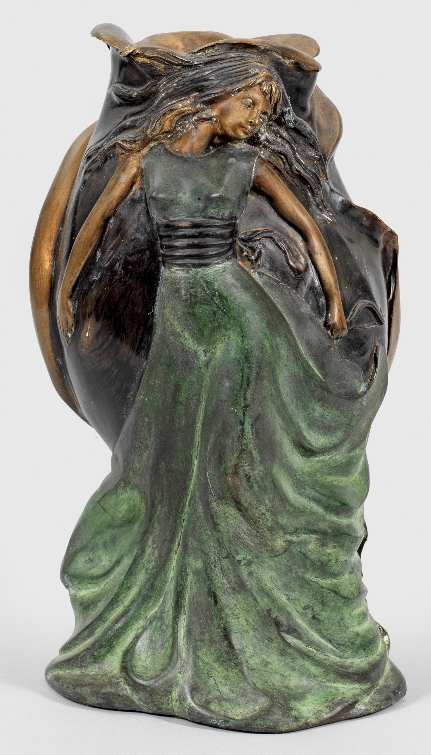 Bronze, in verschiedenenen Tönen patiniert. Reliefplastische Vase, in der Tradition des Jugendstils bzw. französischen Art Nouveau gestaltet, mit dem Rücken an den Korpus in Gestalt einer Rosenblüte geschmiegt stehendes Mädchen in langem Kleid bzw. ein schlafender Amor. H. 47 cm.