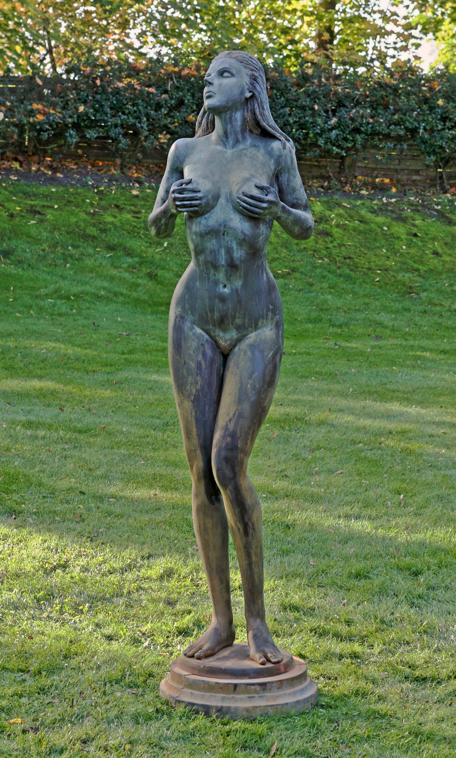 Bronze, dunkel patiniert, teilw. gewachsene Patina. Auf einer runden, abgetreppten Plinthe im leichten Kontrapost stehender Akt mit langen Haaren. Die bewußt sinnlich-erotische Ausstrahlung der in seiner weiblichen Körperlichkeit dargestellten Statue verstärkt der Bildhauer durch die vor die Brüste gehaltenen Hände und den nach hinten geneigten Kopf mit geschlossenen Augen. Unterer Teil der Plinthe gebrochen. H. 168 cm.