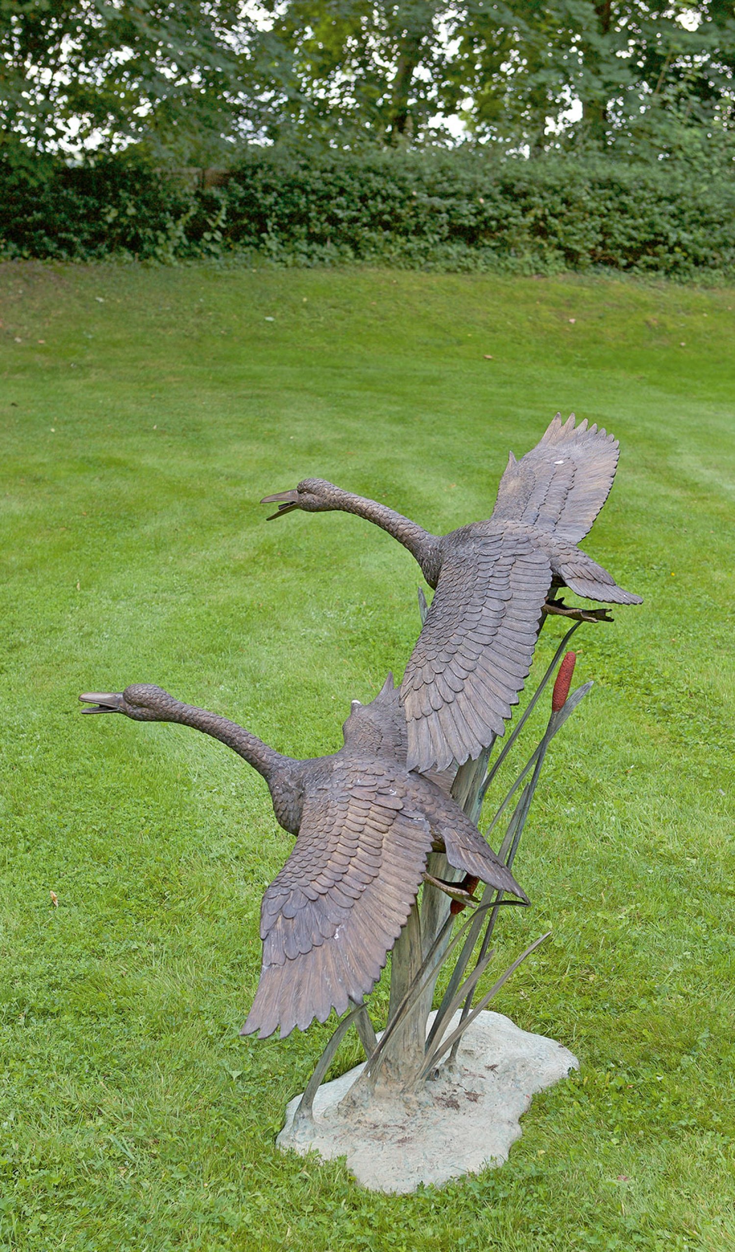 Bronze, braun bzw. in hellgrünlichen und hellgrauen Tönen patiniert. Vollplastisch gearbeitete, naturnah gestaltete, fliegende Schwäne mit detailreicher Federzeichnung über einem Natursockel mit Schilf. H. ca. 112 cm.