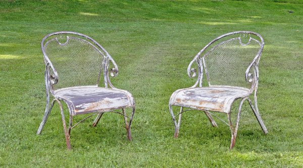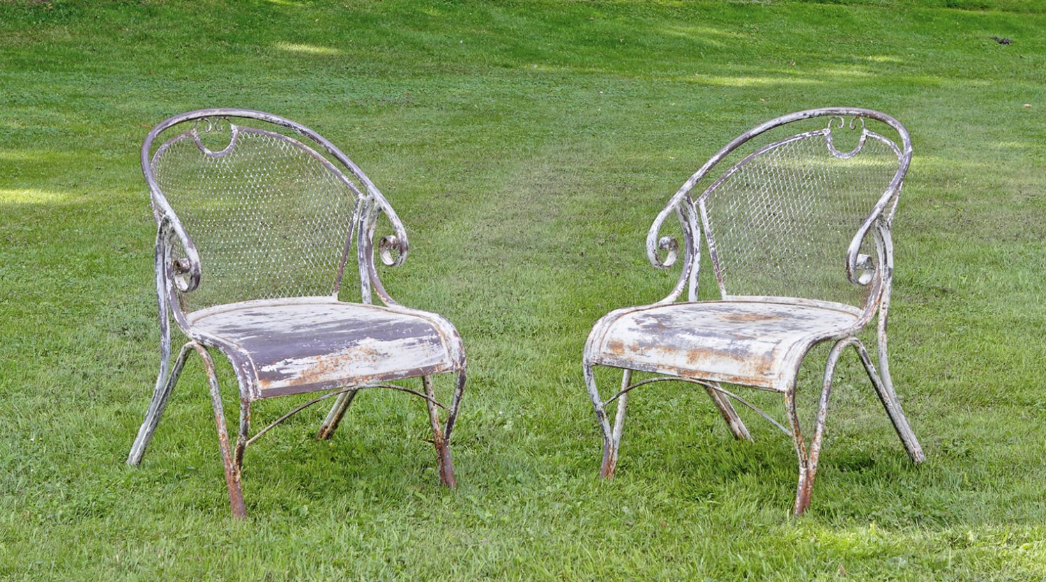 A pair of French metal garden armchairs.