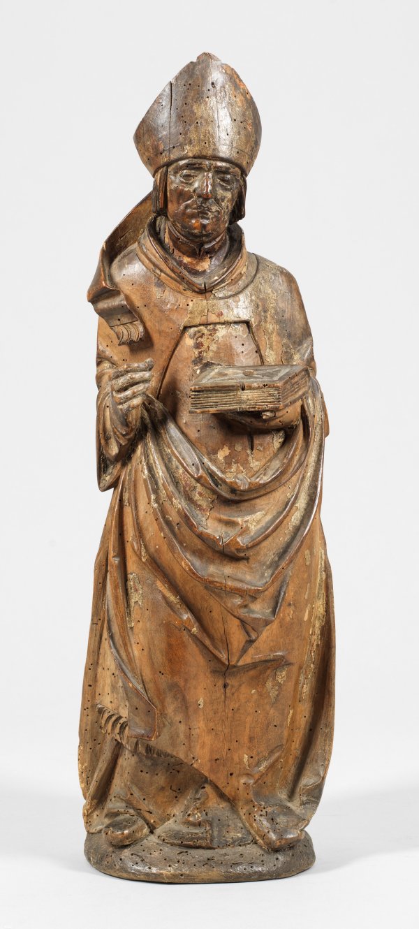Lindenholz, vollrund geschnitzt. Darstellung des Hl. Nikolaus von Myrra als Bischof im Ornat. Einst als einer der Vierzehn Nothelfer einen großen gotischen Altar bekleidend, wissen wir heute leider nicht mehr, wo der Heilige einst stand. Eine Verortung in den Süden Deutschlands ist aufgrund der Faltengebung möglich. Bischofsstab in der rechten Hand fehlt, sowie wohl die drei Goldkugeln auf dem Buch in seiner linken Hand. Reste der originalen polychromen Fassung sind in vereinzelten Schollen erhalten, sowie die partielle Vergoldung auf dem Bischofsgewand. H. 66 cm.