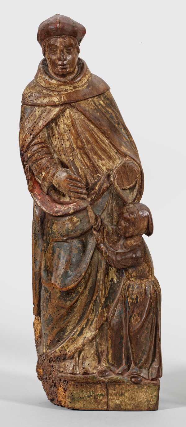 Nussbaumholz, geschnitzt. Vollplastische, rücks. abgeflachte Darstellung eines in feinen Zügen geschilderten Diakons im Stil der Spätgotik mit einer deutlich manieristischen Überlängung des Körpers. Gekleidet in bodenlanger Albe und Überwurfmantel mit Birett auf dem Kopf, mit der rechten Hand einer kleinen Frauenfigur an seinem Fuß einen Gegenstand reichend. Reste polychromer Fassung, linke Hand des Diakons und rechte Hand der Votantin fehlen. H. 54,5 cm.