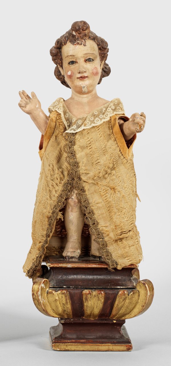 Holz, vollplastisch geschnitzt, polychrom gefasst, eingesetzte Glasaugen. Darstellung des unbekleideten Christusknaben mit lockigem Haar auf Holzsockel, die Rechte im Segensgestus erhoben, in der linken Hand wohl einst eine Osterfahne als Zeichen der Auferstehung haltend. Originalfassung übergangen, minim. besch., rest.; Skulpturen-H. 35 cm.