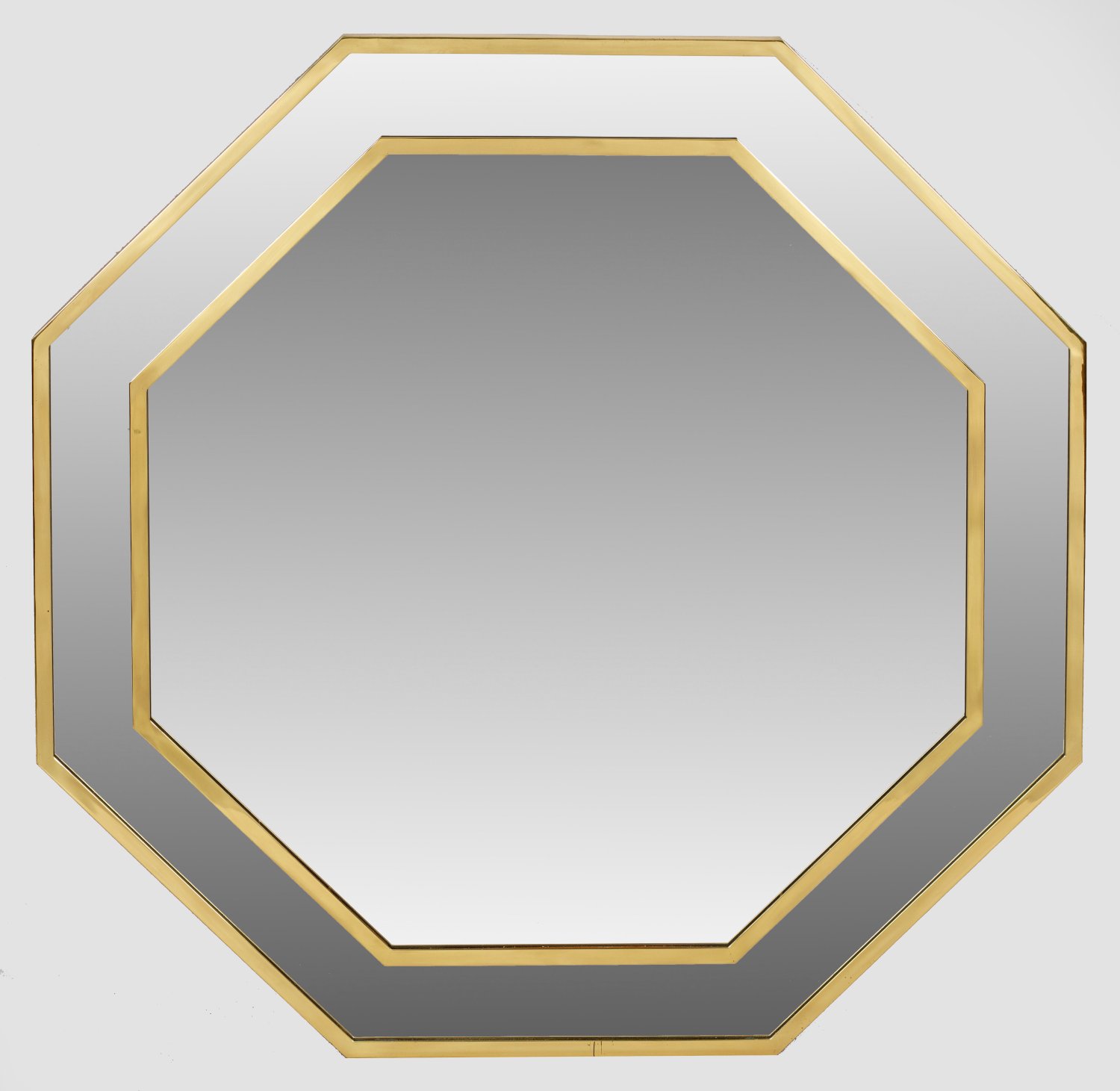 Messing. Oktogonaler, flächendeckend mit Spiegelglas belegter Korpus, umlaufend mit schmaler, zweigeteilter Rahmung. 120 cm x 120 cm.