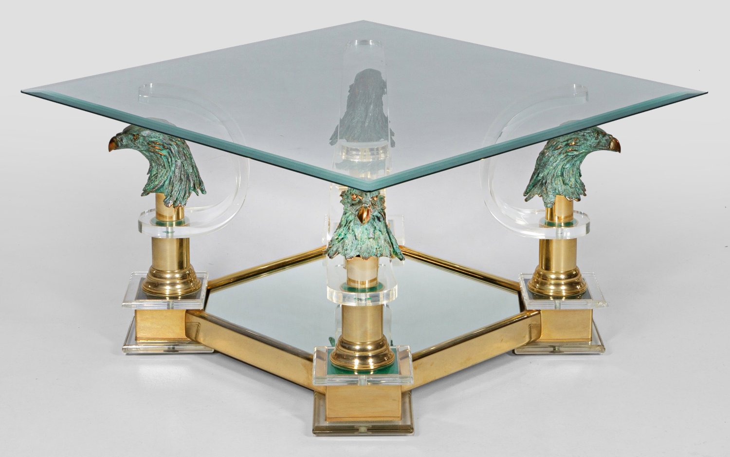 Farbloses Acrylglas, Glas, Spiegelglas, Messing und patinierte Bronze. Über flachem an den Ecken stark verkröpftem Sockel kurze Balusterschäfte mit vollplastischen Adlerköpfen sowie breite, gebogte Streben als Träger für quadratische Deckplatte. H. 47 cm. 85 cm x 85 cm.