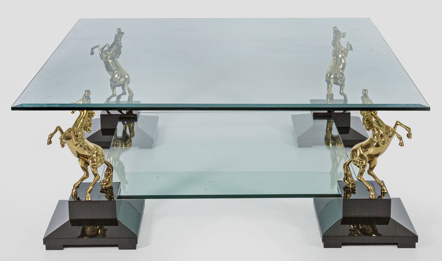 Schwarzer Lackfond, Messing und farbloses Glas. Über gekanteten Podestsockeln vollplastische Darstellungen von steigenden Pferden als Träger für quadratische, facettierte Deckplatte. Unterhalb eingezogenes Ablagefach. H. 45 cm. 115 cm x 115 cm.