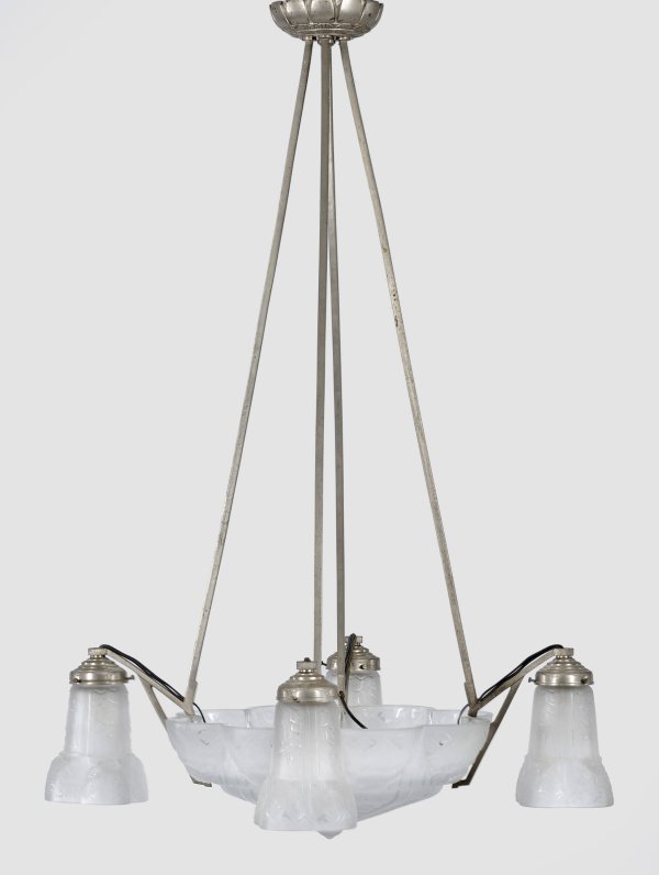 4-flg.; Metall, vernickelt sowie farbloses, satiniertes Glas. Passig geschweifte Lampenschale mit reliefiertem Blütendekor. Davon ausgehend schräge Leuchterarme mit korrespondierenden, kelchförmigen Lampenschirmen. Aufhängung aus schräggestellten Vierkantstäben. Innen vier weitere Lampenfassungen. Elektrifiziert. H. 90 cm. D. 60 cm.