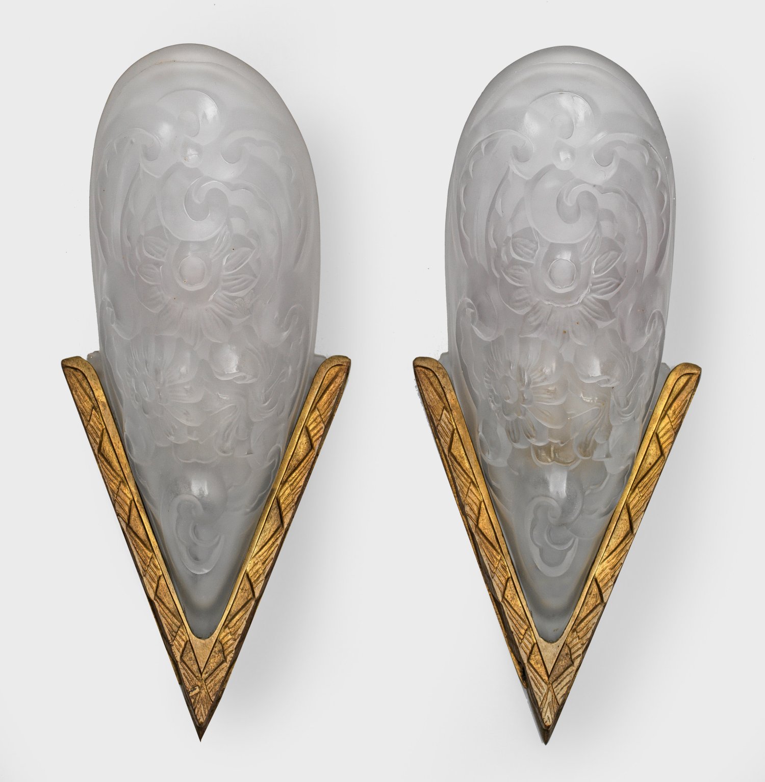 A pair of French brass and glass wall lamps. Minor flaws.