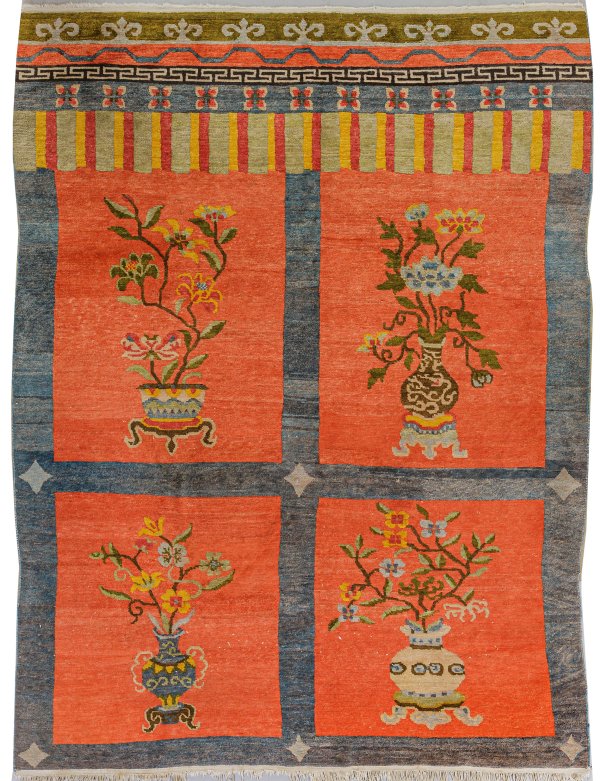 Tibet. Um 1960. Wolle auf Baumwolle. Asymmetrisch gestaltete Musterung aus vier großen Vasenmotiven auf rotem Fond, begrenzt von grau-blauen, abraschierten Stegen. Eine Kurzseite mit unterschiedlich gemusterten Borten. 213 cm x 287 cm.