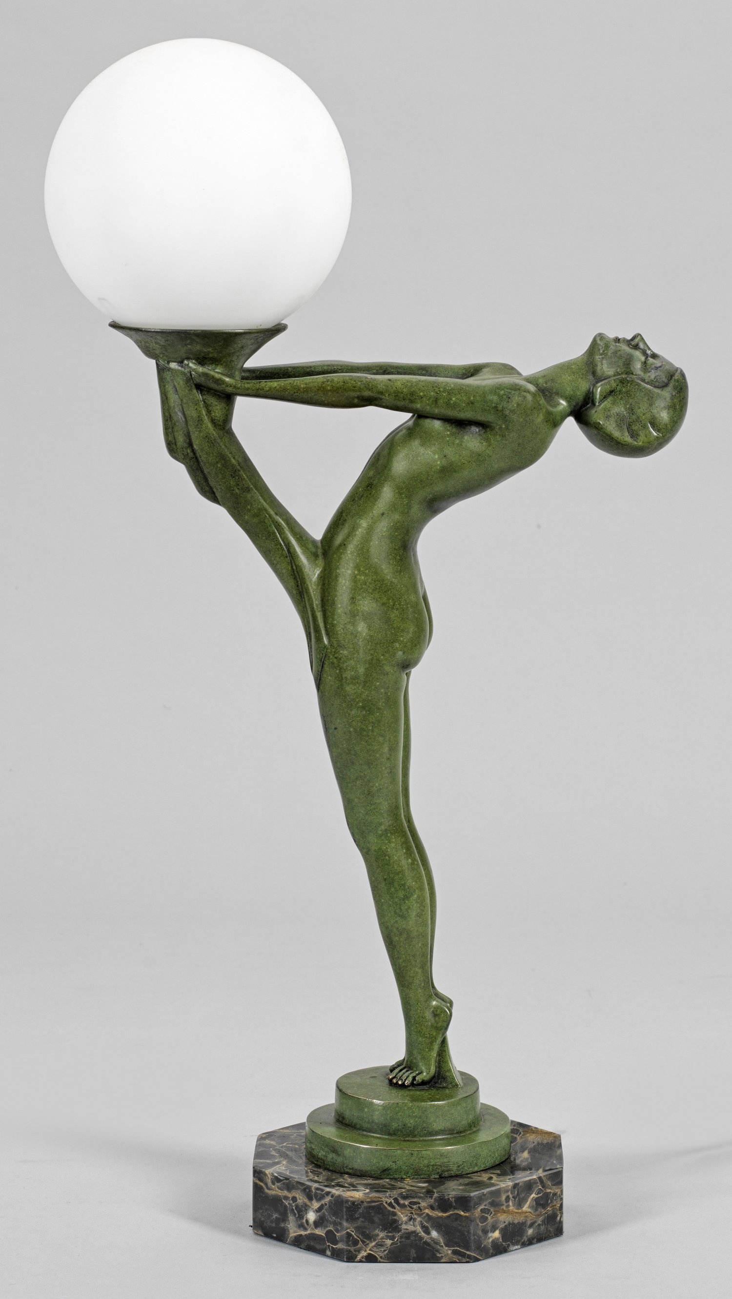 1-flg.; Anthrazitfarbener Marmor sowie grün patinierte Bronze. Vollplastische Darstellung eines gestreckten weiblichen Aktes, in ihren Händen den kugelförmigen Lampenschirm emporhaltend. Unterhalb gestuft ansteigender Sockel. Elektrifiziert. Entw. Max Le Verrier, 1928. H. 67 cm.