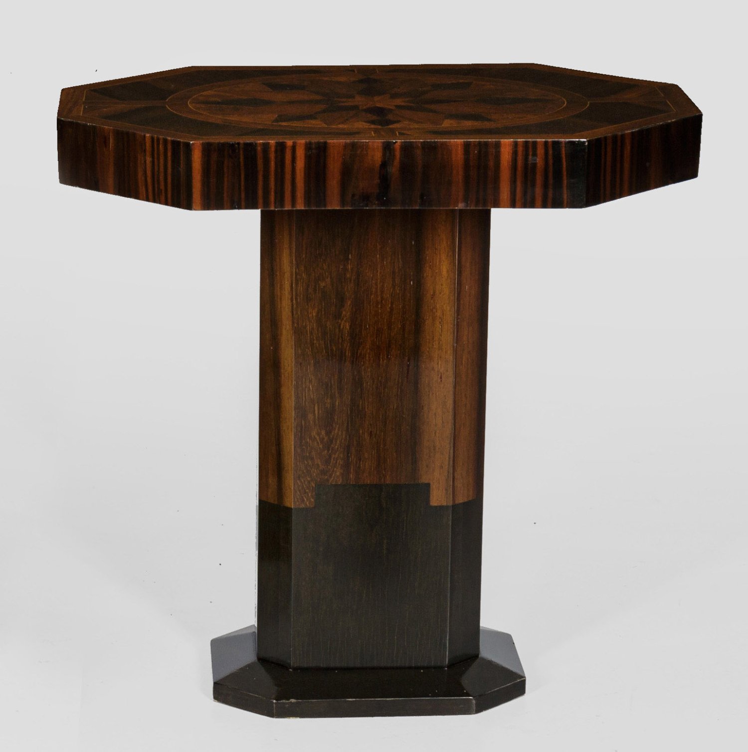 Palisander furniert sowie Einlagen aus unterschiedlichen Edelhölzern. Über schräg ansteigendem Sockel breiter, gekanteter Schaft als Träger für korrespondierende Deckplatte mit großer Sternintarsie. Unterhalb Reste eines Etiketts "Atelier Primavera". H. 63,5 cm. 65 cm x 43 cm.