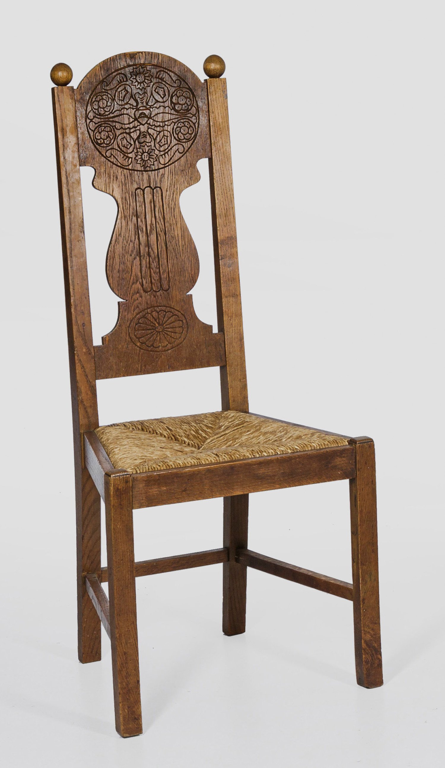 Eichenholz, massiv und furniert. Trapezförmige Zarge auf pfostenförmigen Beinen, unterhalb durch schmale Stege verbunden. Hohe, korrespondierende Rückenlehne mit Kugelbekrönungen sowie balusterförmigem Mittelsteg mit Reliefdekor. Sitzfläche aus Geflecht. Unbez.; Entw. Heinrich Vogeler, 1909. Sitz-H. 45 cm.