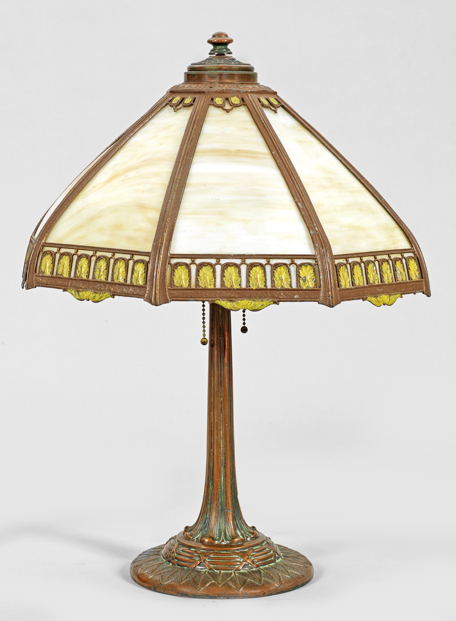 3-flg.; Kupfer und Weißmetall, farbig lackiert sowie weiß-gelb marmoriertes Glas. Über gestuft ansteigendem, blattreliefiertem Rundsockel sich konisch verjüngender Schaft als Träger für Leuchtmittel. Oberhalb kuppelförmiger, durchbrochen gearbeiteter Lampenschirm aus schmalen Stegen. Elektrifiziert. H. 58 cm.