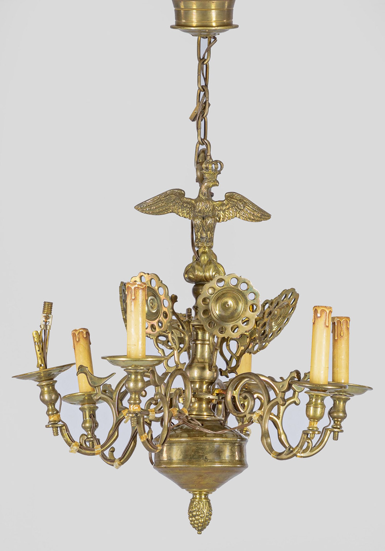 6-flg.; Bronze. Balusterförmiger Schaft, davon ausgehend stark geschwungene Leuchterarme mit großen Traufschalen über vasenförmigen Tüllen. Durchbrochen gearbeitete, rosettenförmige, sonnenförmige Blaker sowie Adlerbekrönung. Elektrifiziert. H. 59 cm. D. 58 cm.