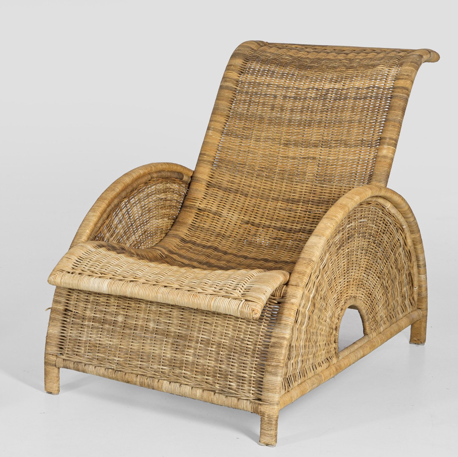Rohrgeflecht. Segmentförmige, durchbrochen gearbeitete Seitenwangen als Träger für stark geschwungene Sitz- und Lehnenfläche. H. 84 cm. 66 cm x 120 cm.