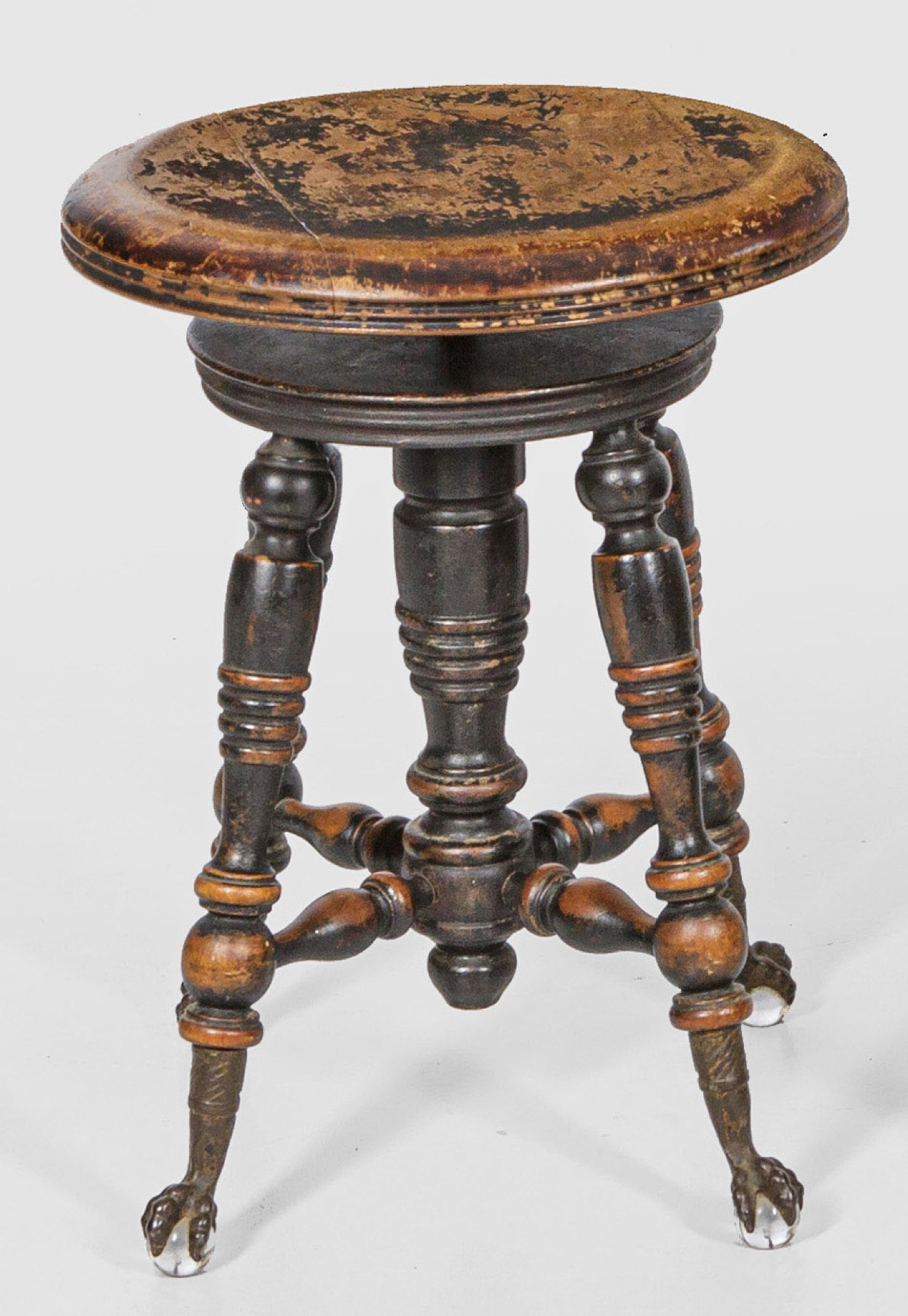Buchenholz, dunkel gebeizt. Korpus aus schräggestellten Balusterstäben mit Klauenfüßen. Runde, profilierte und höhenverstellbare Sitzfläche. Herstellerzeichen. H. 49 cm - 59 cm.