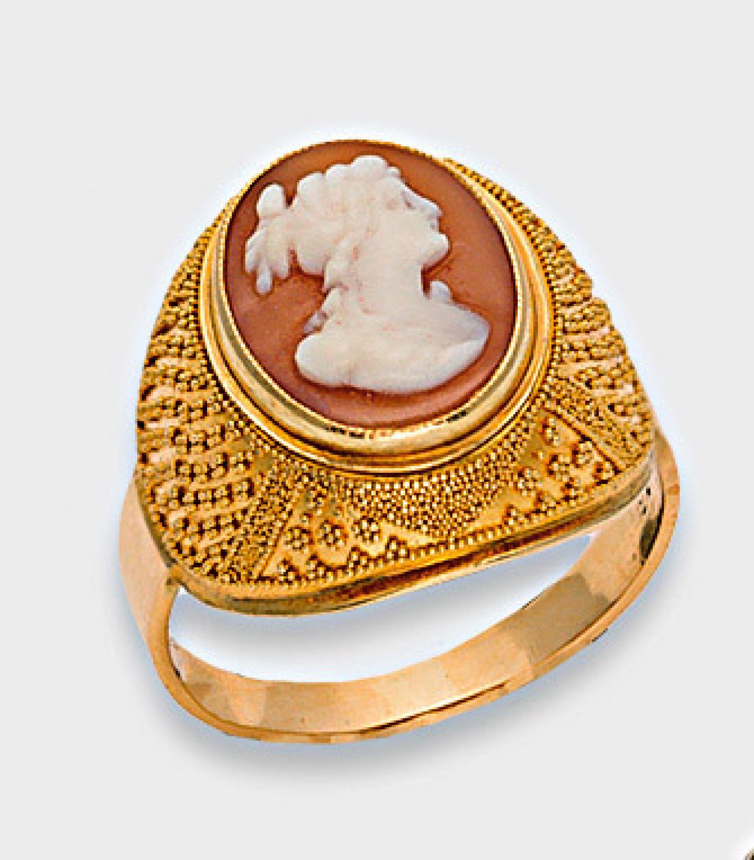 Gelbgold, gest. 750. Bombierter Ringkopf mit feinem ornamentalen Granulatdekor, mittig Muschel-Camée mit Porträt einer jungen Dame. Gew. ca. 6,61 g.