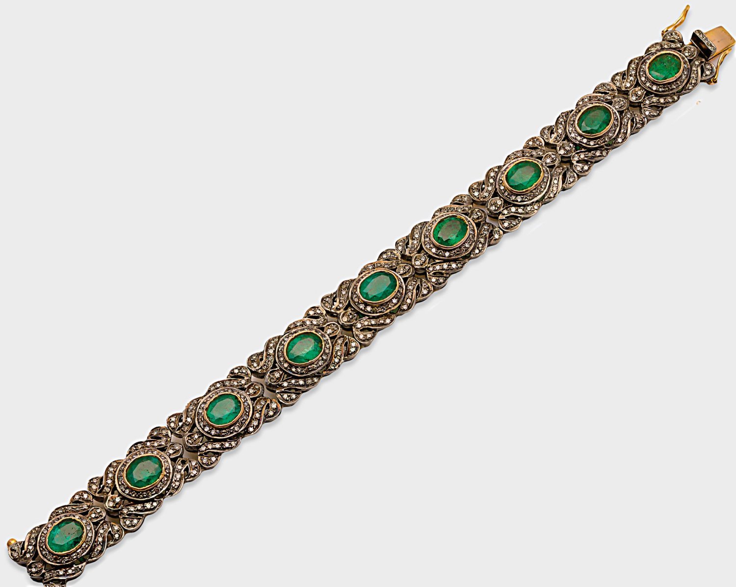 Russian bracelet set with diamonds approx. 3,00 ct. and emeralds approx. 8,70 ct., in silver and 14 k gold.