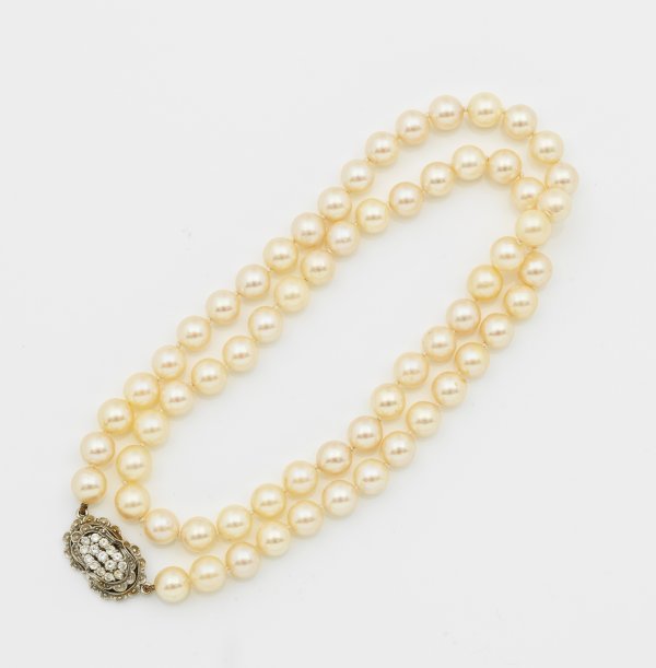Weißgold, 14 ct.; Einreihige Kette aus cremefarbenen Zuchtperlen von ca. 7,8 mm in sehr farbintensivem rosé-grün changierendem Lüster. Schließe besetzt mit Diamanten von zus. ca. 0,60 ct.
