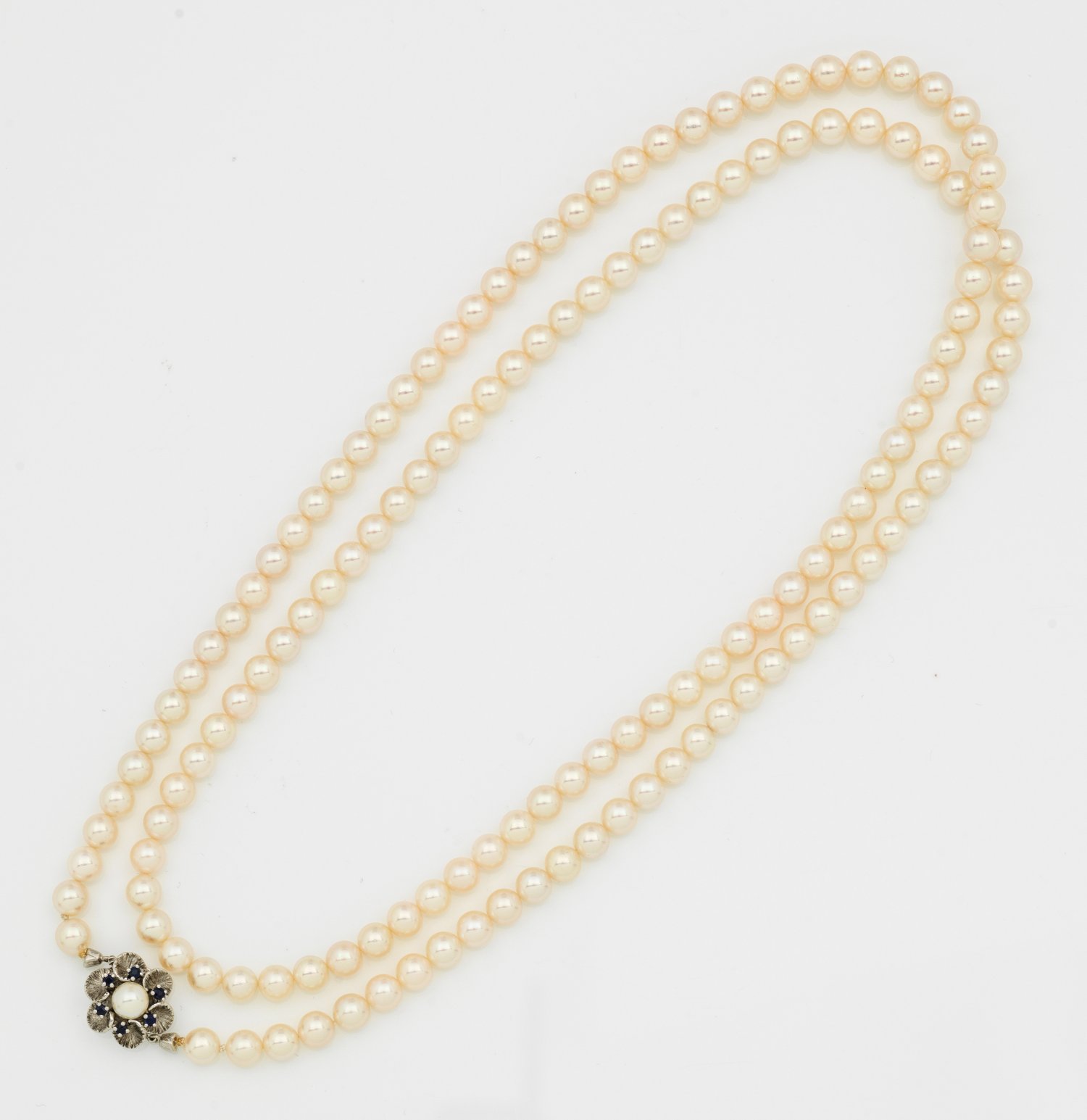 Necklace set with white culture pearls approx. 7 mm. Clasp set with sapphires, in 14 k white gold.