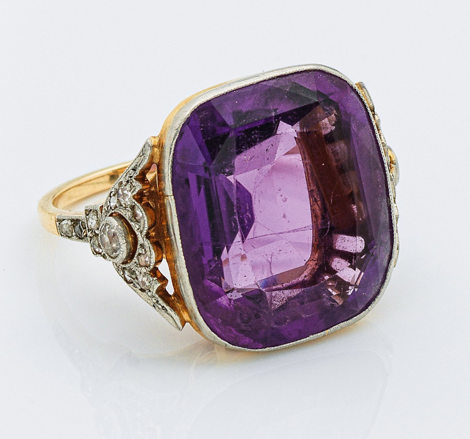 Roségold, 14 ct.; Zentral besetzt mit einem fliederfarbenen Amethyst von ca. 17,1 mm x 15,1 mm, flankiert von kleinen Altschliffdiamanten von zus. ca. 0,30 ct.; Gew. ca. 7,50 g.
