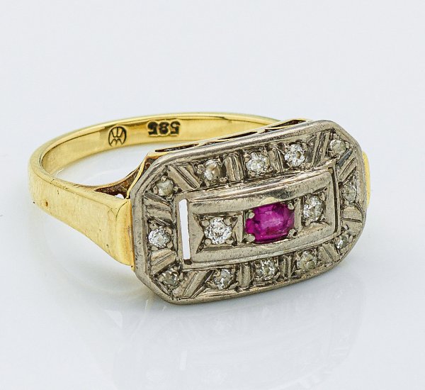 Gelbgold, gest. 585, teilw. platiniert. Zentral besetzt mit einem pinkfarbenen Rubin, entouriert von Altschliffdiamanten. Gew. ca. 5,54 g.