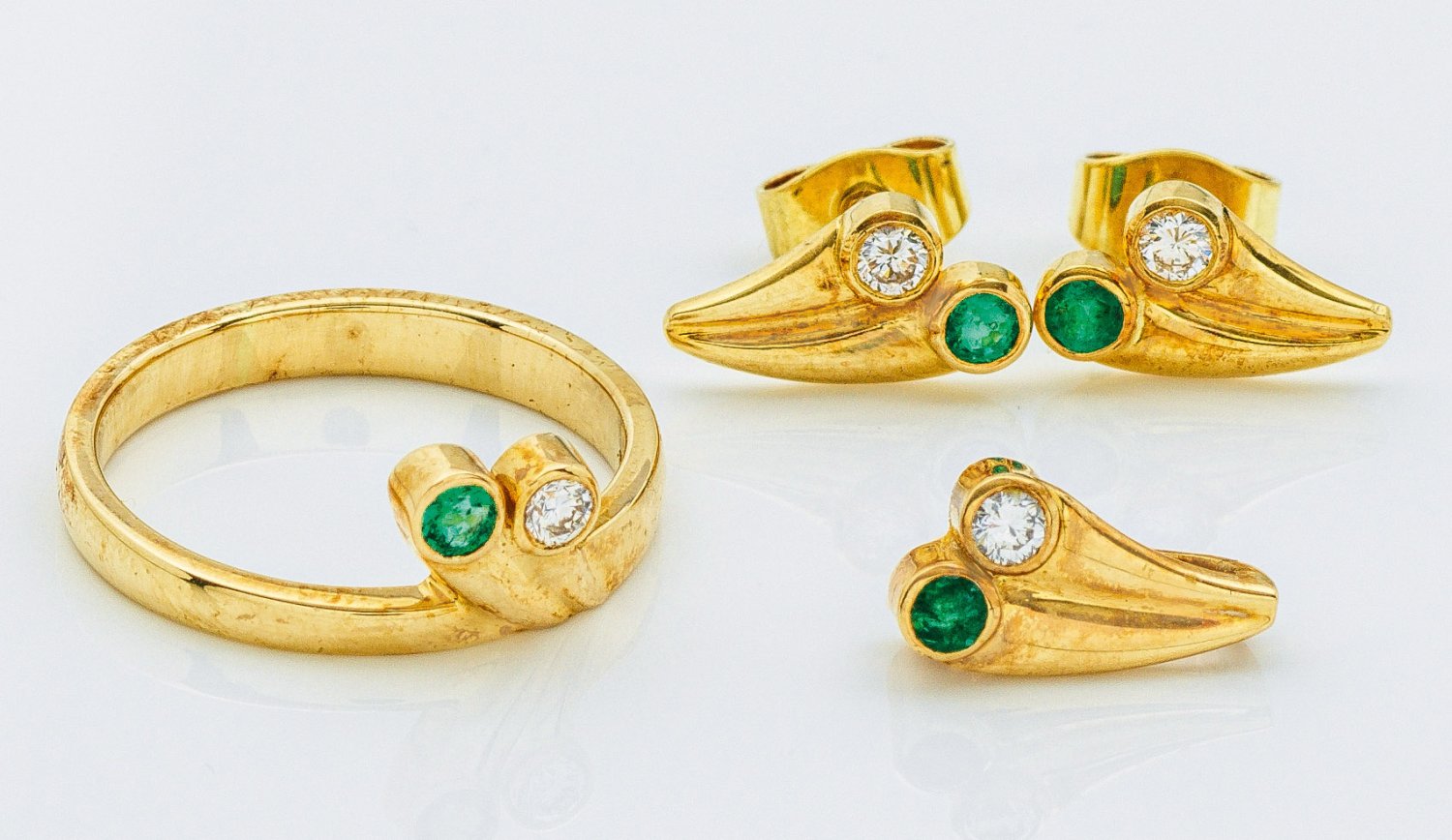 Ring, Anhänger und Paar Ohrstecker. Gelbgold, gest. 750. Besetzt mit leuchtendgrünen Smaragden von zus. ca. 0,30 ct.und Diamanten von zus. ca. 0,20 ct. (F-G/vsi). Ges.-Gew. ca. 6,34 g.