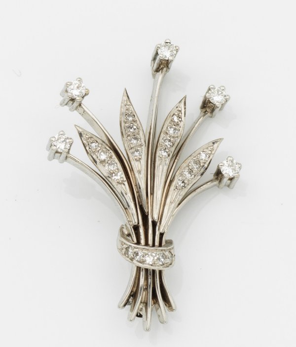 Weißgold, gest. 585. In Form eines Blumenstraußes, zentral besetzt mit Diamanten. Gew. ca. 6,44 g.
