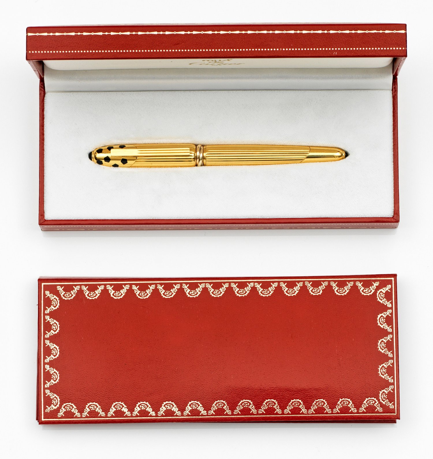 Metall, vergoldet sowie kleine Reserven aus Schwarzlack. Konischer, teilw. godronierter Korpus mit eingelassenem Trinity-Ring. 18 k Goldfeder. Herstellerzeichen 1990 sowie Seriennummer 019404. L. 13 cm. Originalbox und Certificat de Garantie.