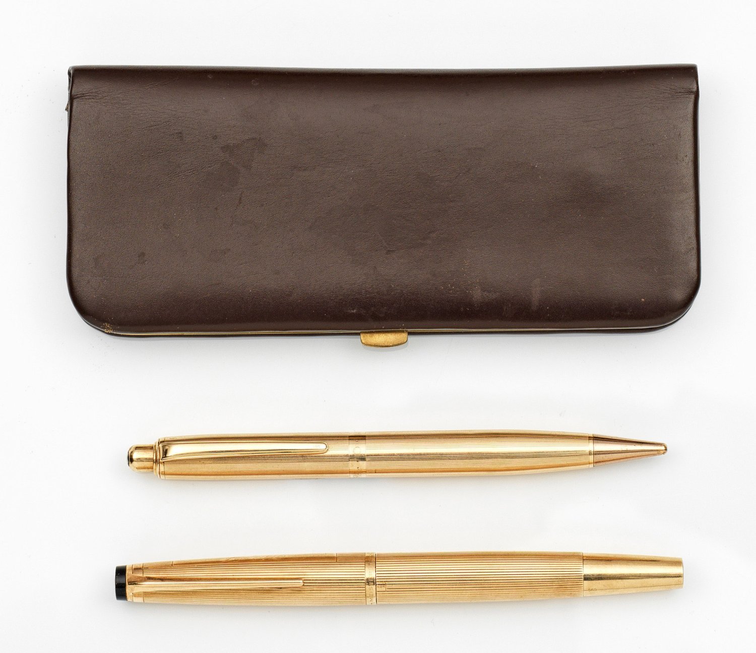 Umlaufend godronierter bzw. fein linierter Korpus. Griffstück des Füllfederhalters aus schwarzem Edelharz. Jeweils Reserve mit graviertem Monogramm W.Z.; Herstellerzeichen sowie gest. 585. L. 13 bzw. 13,5 cm.