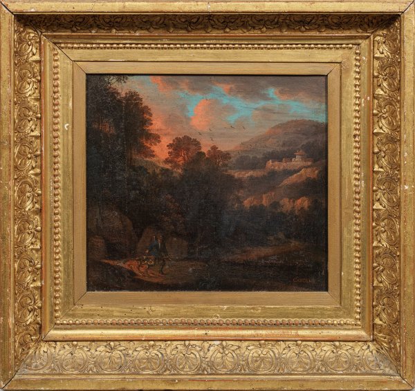 Abendlich gestimmte, atmosphärische Landschaft in der Tradition von Gaspard Poussin (Dughet), der mit seinen Werken die Landschaftsmalerei vom Barock bis Klassizismus nachhaltig beeinflusste. Öl/Lwd.; R. u. sign.; 25,5 cm x 28 cm. Original-Rahmen.