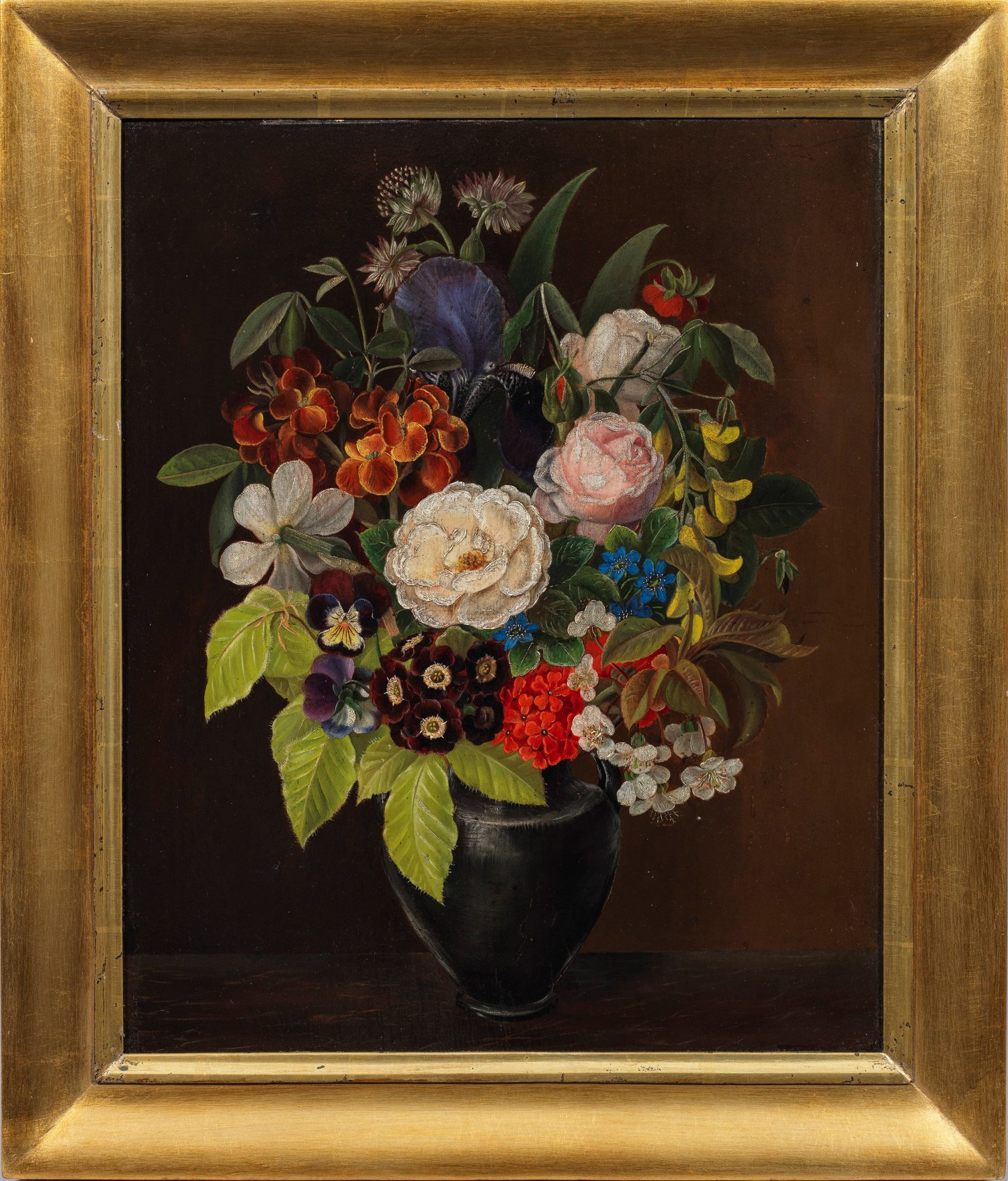 Vor neutralem Hintergrund fein gemalter, in einem Tonkrug arrangierter, spätbiedermeierlicher Blumenstrauß mit Buschrosen, Goldregen, Veilchen, Kleeblüten und anderen farbenfrohen Sommerblühern. Stiltypisches Stillleben der Jensen-Schule mit fein lasierend gemalten, naturgetreuen Blumen, bei dem die leuchtend farbigen Blüten effektvoll vor einem dunkleren Hintergrund komponiert sind. Öl/Holztafel. 39,5 cm x 32 cm. Rahmen.
