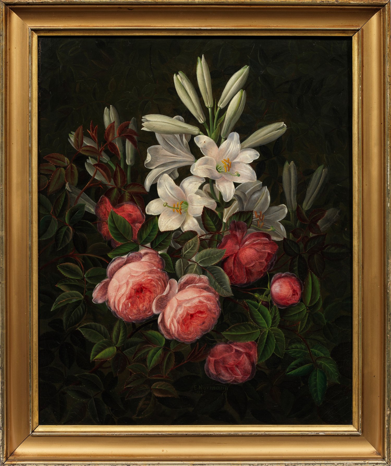 Subtiles, feinmalerisches Blumenstillleben mit roten Buschrosen und weißen Lilien in effektvollem Licht- und Schattenspiel. Öl/Lwd.; R. u. sign. und dat. 1854. Craquelée. 57 cm x 47,5 cm. Rahmen.