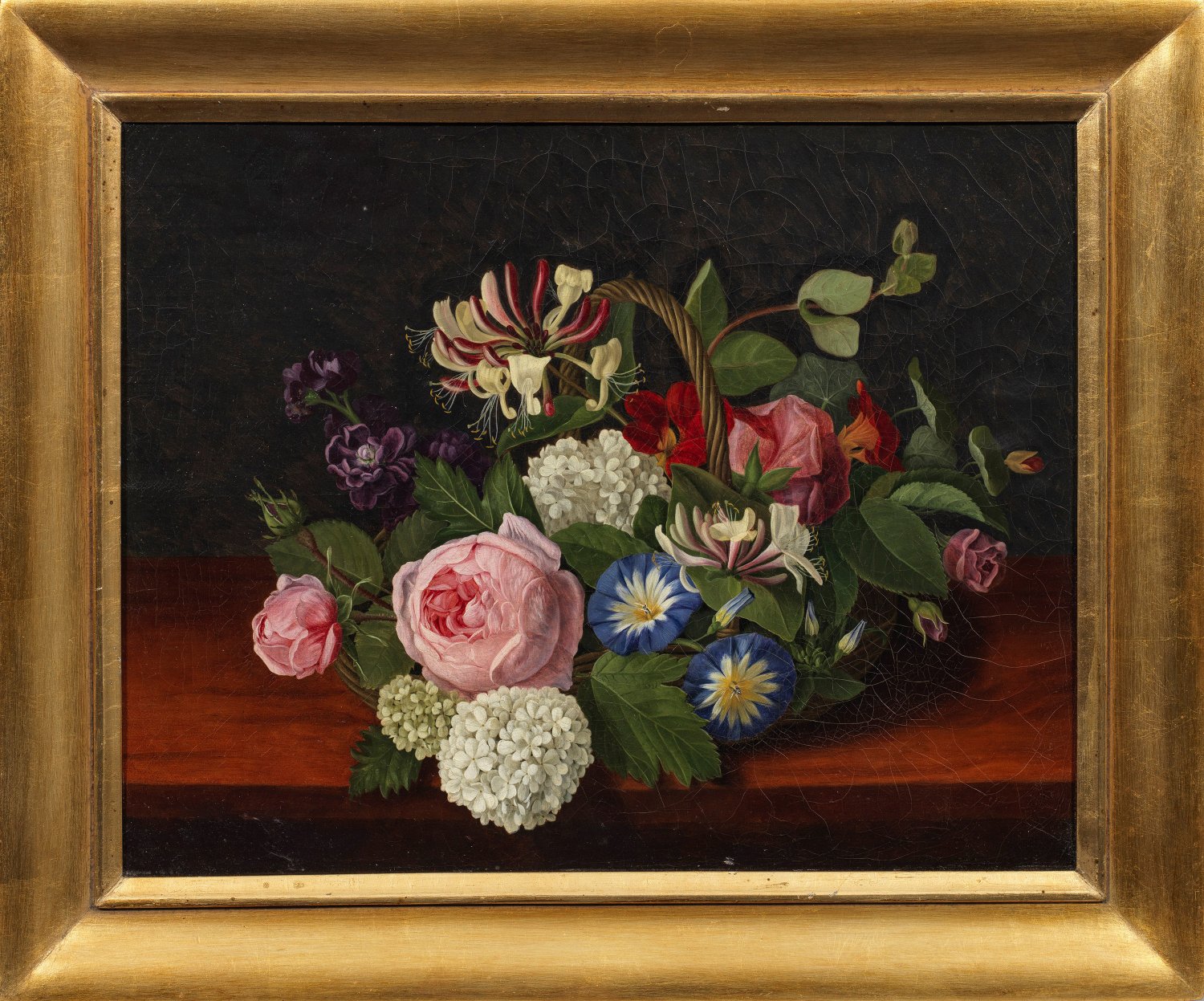 Auf einem Holztisch in einem gehenkelten Weidenkorb arrangiertes, spätbiedermeierliches Blumenarrangement mit Buschrosen, Prunkwinden, Flieder und anderen farbenfrohen Sommerblühern. Die ausgewogene Komposition und die treffliche Wiedergabe der dargestellten Blüten verweisen auf den nahen Umkreis des Kopenhagener Künstlers. Öl/Lwd.; 31 cm x 40 cm. Rahmen.