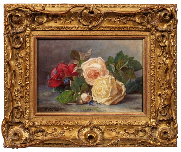 Realistisches Stillleben Lobedans, welche die duftig geschilderten Blüten durch effektvolle Lichtakzente hervorhebt. Die Blumen- und Stilllebenmalerin lernte bei Theude Grönland und Prof. L. Gussow in Berlin, 1868-1893 beteiligte sie sich vielfach an Ausstellungen in Berlin und Dresden. Öl/Holztafel; L. u. sign. u. dat. (18)71. Verso handschriftlich bez. "Clara Lobedan / Berlin Rosen zur Verlobung". 21,3 cm x 28,8 cm. Rahmen.