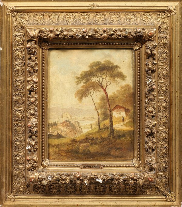 Das Licht und die Farben fein nuanciert wiedergebende Darstellung des österreichischen Landschaftsmalers. Öl/Holztafel. R. u. sign. Nachgedunkelt, Craquelée. 26,5 cm x 21 cm. Rahmen.