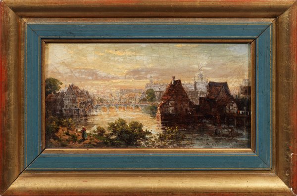 In pastelliges Abendlicht getauchte, atmosphärische Breslauansicht Wölfls, der Schüler bei Ernst Resch in Breslau war. Zunächst schuf er romantische Landschaften und konzentrierte sich schließlich auf Ansichten des alten Breslau. Öl/Lwd.; R. u. schwer leserlich sign. und dat (1)857. Verso bez. "A. Wölfl Breslau" sowie "Blick v der großen Holzgasse auf die Unter(?)stät Breslau". Craquelée. 12 cm x 23,5 cm. Rahmen.
