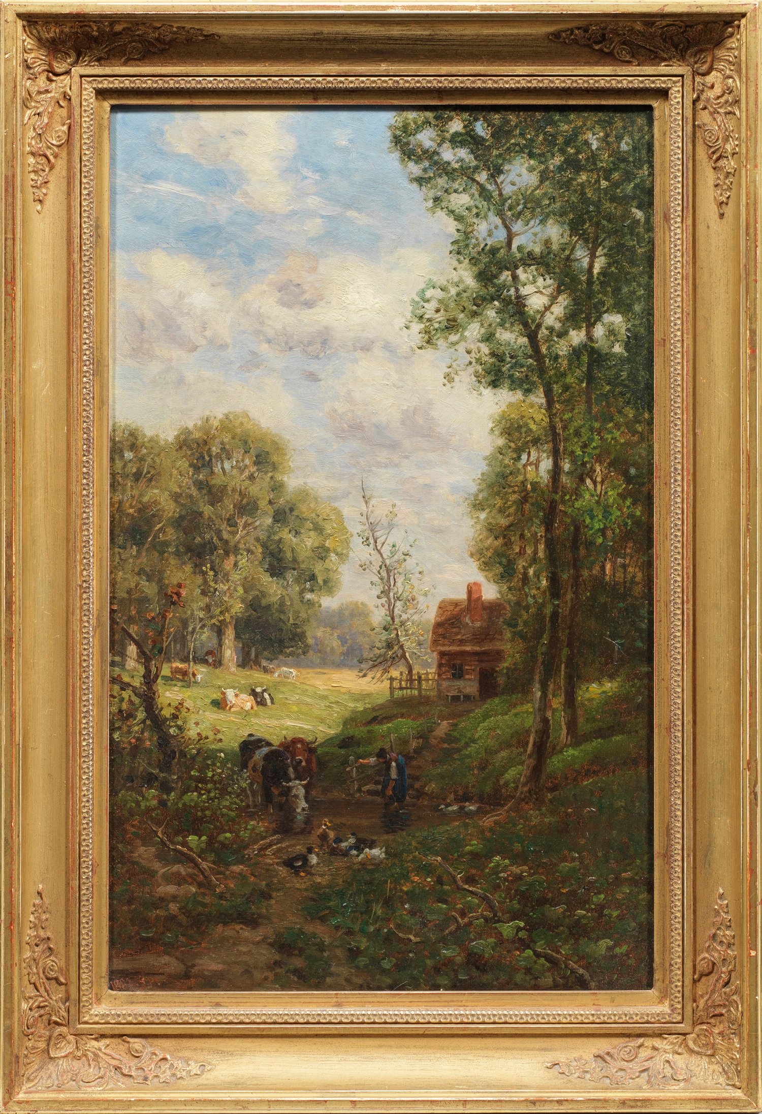 Blick auf eine sonnenbeschienene Lichtung mit Viehherde, im Vordergrund ein Weiher mit Bäuerin beim Wasserholen, Entenschar und Kühen. In der subtilen, feinfühligen Erfassung des Lichts virtuoses, impressiv angelegtes Werk des Freilichtmalers, der 1870 nach München ging und 1879-1913 die Jahresausstellungen im Glaspalast beschickte. Öl/Lwd.; L. u. sign.; 56,5 cm x 35,5 cm. Rahmen.