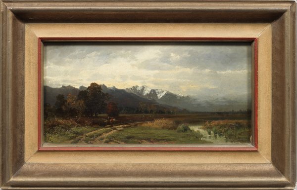 Atmosphärisch geschilderte Partie aus dem Chiemgau. In Kolorit, Stil und Motiv repräsentatives Tableau Herrmanns, der in Wiesbaden und München tätig war und überwiegend Landschaften der oberbayerischen Hochebene schuf. Öl/Holz. R. u. sign. und ortsbez. München. Verso auf Galerieetikett bez.; Ca. 20 cm x 40 cm. Rahmen.