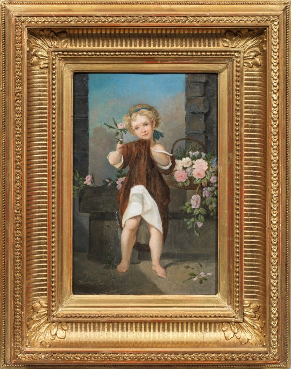 Oil on wooden panel. Signed. Crack. Minor Crazing.
